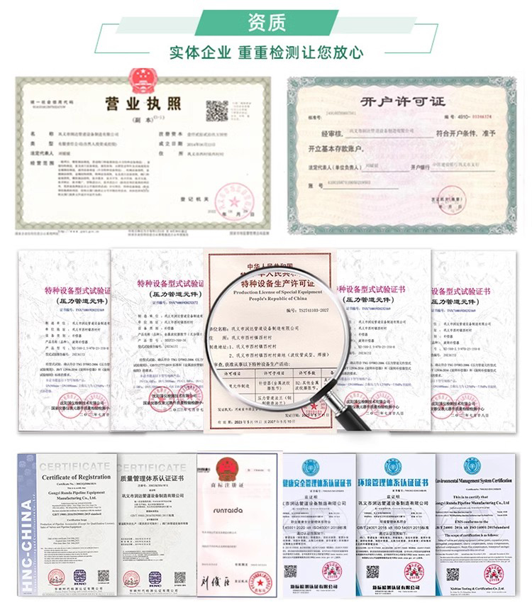 公司注冊商標“潤泰達”。 公司通過ISO9001:2008質量管理體系認證,行業十幾年生產經驗,多年工藝與品質積累,只為給您提供更好的管道產品。公司設有嚴格的質量控制體系,標準的生產工藝流程,規范的出廠檢測手段,確保出廠的產品達到標準和客戶的要求。 潤達管道企業使命: 讓管線運行更安全 企業愿景: 1.創建有夢想、有文化、有情有義的現代化企業 2.尊重個人、成就員工
