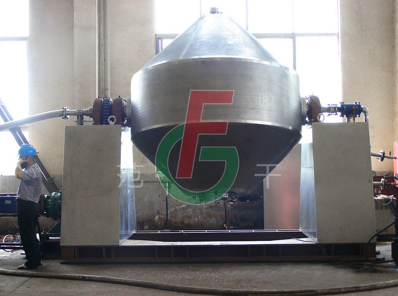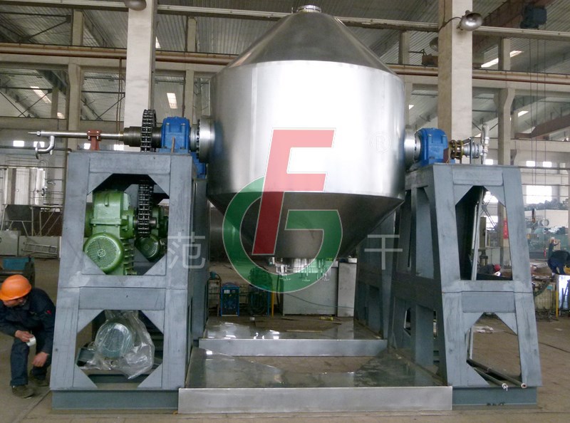 SZG雙錐回轉(zhuǎn)真空干燥機為雙錐形的回轉(zhuǎn)罐體,罐內(nèi)在真空狀態(tài)下,向夾套內(nèi)通入蒸汽和熱水進行加熱,熱量通過罐體內(nèi)壁與濕物料接觸。濕物料吸熱后蒸發(fā)的水汽,通過真空泵經(jīng)真空排氣管被抽走。由于罐體內(nèi)處于真空狀態(tài),且罐體的回轉(zhuǎn)使物料不斷的上下,內(nèi)外翻動,故加快了物料的干燥速度,提高干燥效率,達到均勻干燥的目的。