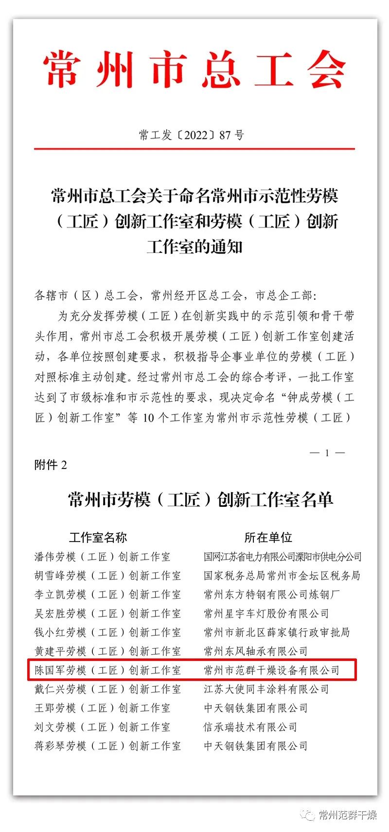日前,常州市總工會(huì)公布17個(gè)常州市勞模(工匠)創(chuàng)新工作室名單,常州市范群干燥設(shè)備有限公司“陳國軍勞模(工匠)創(chuàng)新工作室”榜上有名。