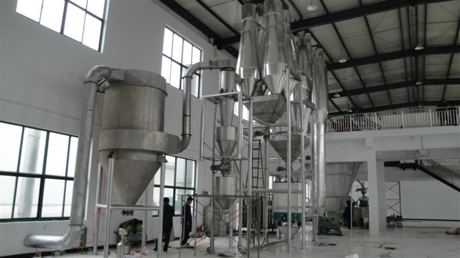 加熱到一定溫度后吹入直立管,在管內的速度決定于濕顆粒的大小和密度,一般大于顆粒的沉降速度(約為10~20米/秒)。已干燥的顆粒被強烈氣流帶出,送到兩個并聯的旋風分離器分離出來,經螺旋輸送器送出,尾氣則經袋式過濾器放空。由于停留時間短,對某些產品往往須采用二級或多級串聯流程。