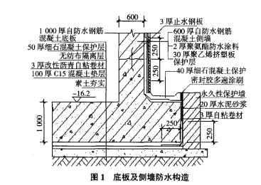 工程設(shè)計(jì)地下室底板厚1 000 mm,強(qiáng)度等級(jí)C35;側(cè)墻厚600 mm,強(qiáng)度等級(jí)為C30,底板與側(cè)墻抗?jié)B等級(jí)均為P10。底板采用3 mm厚濕鋪?zhàn)哉撤浪聿耐夥劳赓N法防水施工,外側(cè)墻采用2.0 mm厚雙組分聚氨酯防水涂料外防法施工,防水設(shè)防等級(jí)為Ⅱ級(jí)。底板及側(cè)墻防水做法,見(jiàn)圖1。