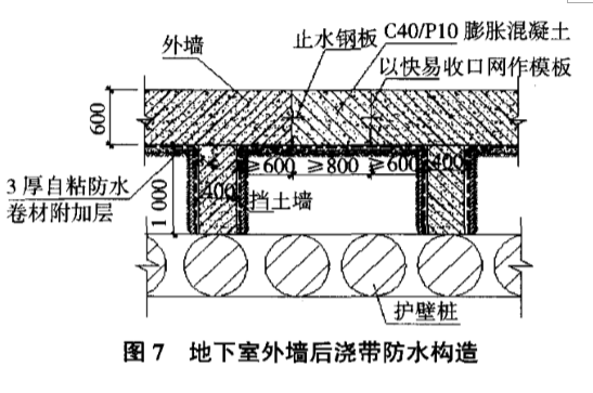 因地下室每施工完成一層并做好防水后,需對(duì)外墻進(jìn)行回填,而地下室側(cè)墻后澆帶則需在兩側(cè)混凝土結(jié)構(gòu)澆筑60 d后補(bǔ)澆C35/P10膨脹混凝土,所以施工時(shí),在外墻后澆帶外大于600 mm處澆筑400 mm厚混凝土擋土墻,使400 mm厚擋土墻正對(duì)護(hù)壁樁,擋土墻配筋10@200,水平筋一端錨人地下室外墻,另一端植筋植入護(hù)壁樁中。回填土前應(yīng)先將擋土墻外側(cè)防水施工完成,待外墻后澆帶混凝土澆筑后再施工擋土墻內(nèi)側(cè)防水。具體施工,見(jiàn)圖7。
